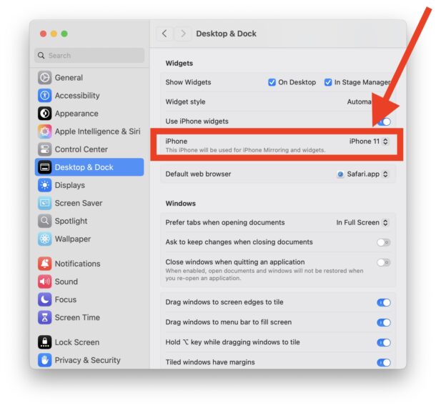* 如果该设置位置对您有意义,则您可能在 Apple 工作,并且是在该位置找到 iPhone 镜像设置的人,因为对于普通最终 Mac 用户而言,这并不是人们真正期望找到 iPhone 镜像设置的位置。奇怪的是,“桌面和 Dock”也是您更改 Mac 上默认 Web 浏览器的地方,甚至可以调整任务控制和舞台管理器,使“桌面和 Dock”设置面板成为与桌面或 Dock 无关的 MacOS 内容的混杂。
