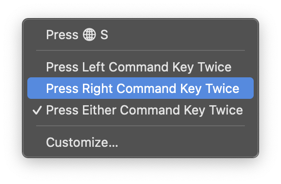 - 选择“键盘快捷键”下拉菜单,选择您所需的键盘快捷键,用于在 MacOS 上输入 Siri,默认选项为:fn/globe+S、按左命令键两次、按右命令键两次、按任一命令键两次、自定义(您可以通过这种方式选择几乎任何键盘快捷键)