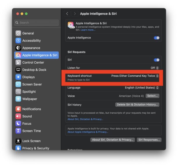 如果您发现自己在 Mac 上双击命令键时意外启动了“键入至 Siri”功能(许多 Mac 用户都发现了这一点),您可以尝试将“键入至 Siri”键盘快捷键切换为 Globe/Fn+S,或者完全使用自定义功能的其他方式。或者,如果您只使用其中一个 Command 键,您可能会发现将键盘快捷键切换到未使用的 Command 键也很有帮助。