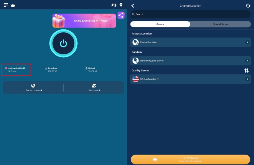 步骤 3.在 VPN 应用程序中,选择可用的服务器位置。