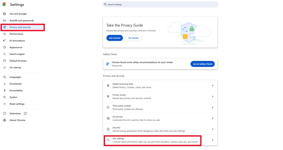 步骤2。然后打设置 > 隐私和安全 > 站点设置.