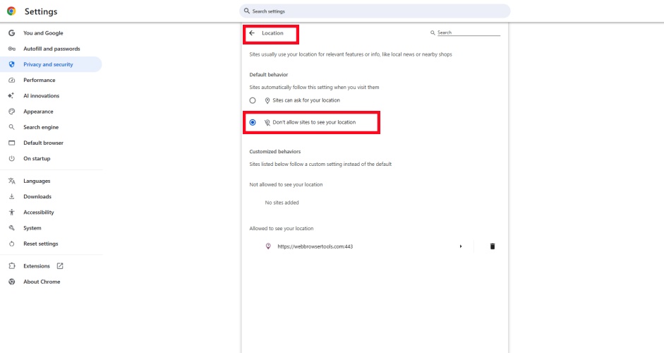 步骤 3.选择不允许网站查看您的位置在下面地点.