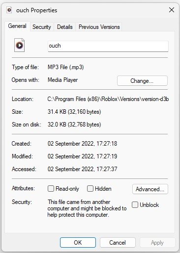 右键单击时哎哟声音文件,您可以看到这是一个.ogg音频文件。您将必须使用相同的文件格式和名称替换首选的声音。