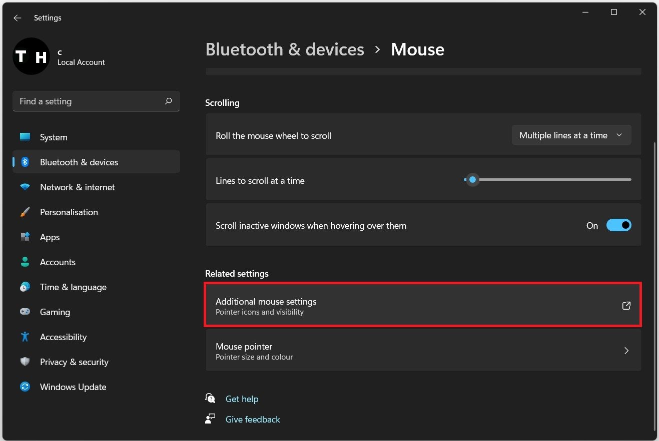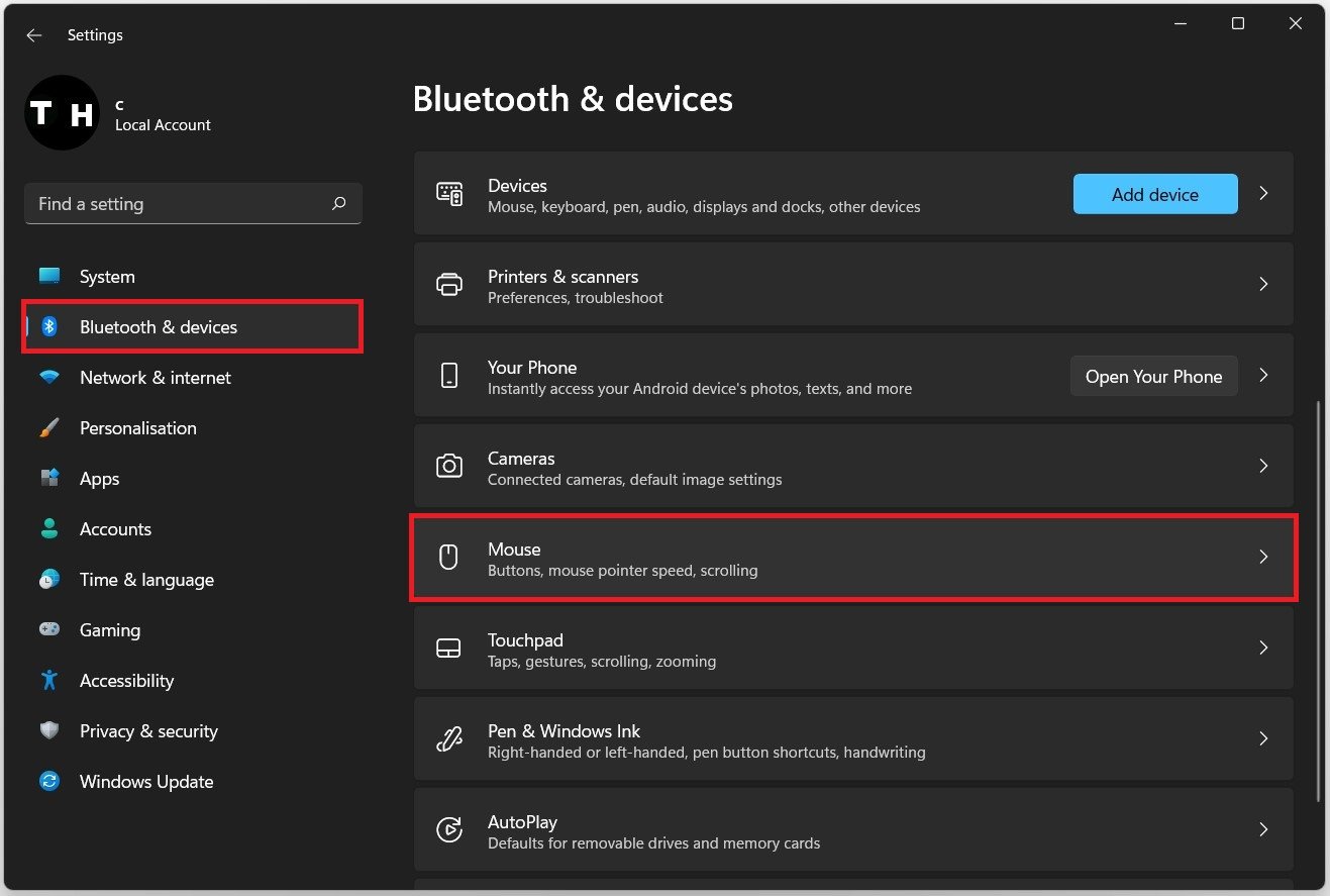 您的鼠标指针速度将决定Windows 11光标与鼠标移动相关的速度或快速。要更改它,请打开系统设置窗口。在蓝牙和设备部分,导航到老鼠。