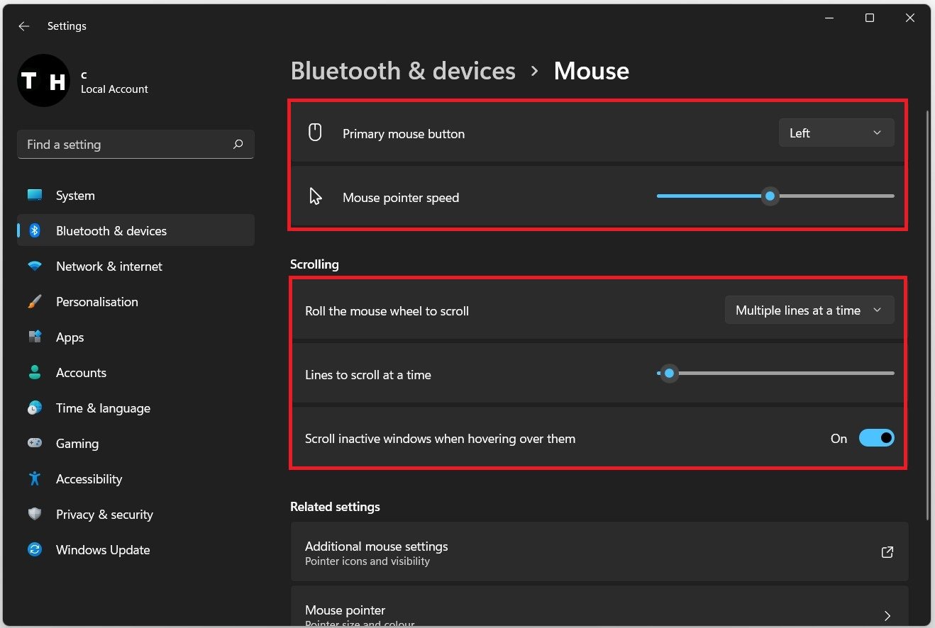 在设置的鼠标部分中,您可以更改您的主鼠标按钮, 你的鼠标指针速度,在您的速度下鼠标滚动是。