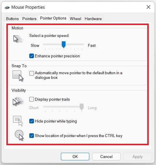 在下面指针选项,您可以选择添加指针跟踪,在打字时隐藏指针,并在使用CTRL键时显示指针的位置,我经常使用。