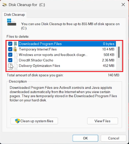 磁盘清理窗口将列出您可以删除的各种类型的文件,例如临时 Internet 文件、系统错误内存转储文件等。