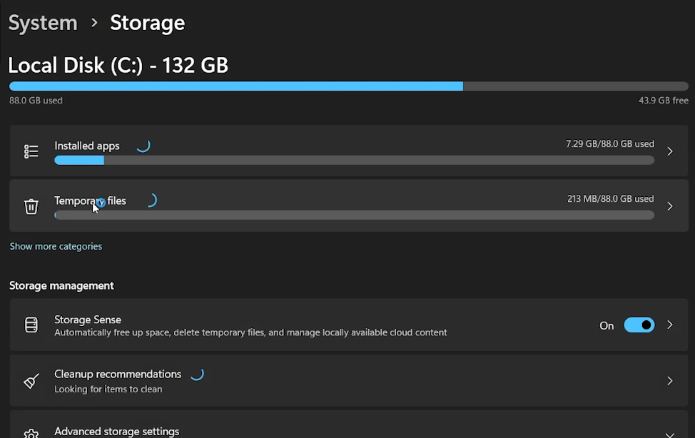进入“设置”>“系统”>“存储”,查看存储使用情况。您可以检查并删除不必要的文件,尤其是“临时文件”和“其他”部分中的文件。