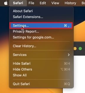 打开您的 Safari 浏览器。如果它在您的 Mac 上看起来有点不同,请确保您运行的是最新的 Mac 操作系统版本。当 Safari 运行时,单击菜单栏中的 Safari 并选择设置。