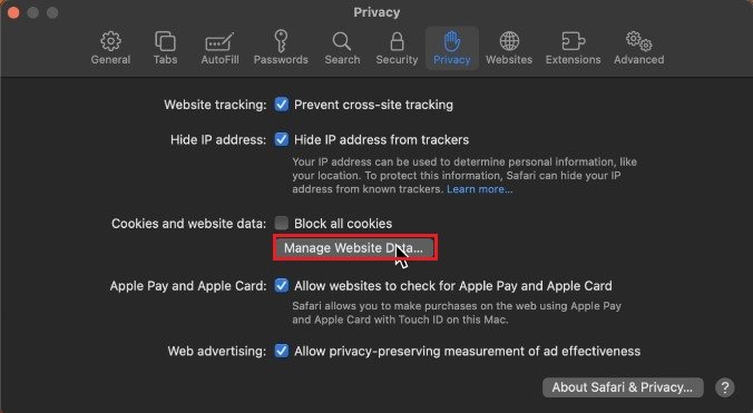 将打开一个新窗口。在这里,在隐私部分,单击管理网站数据。这将允许您查找网站并清除其各自的缓存、cookie 和网站数据。