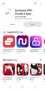 - 转至设备的应用商店,搜索 Surfshark,然后安装该应用。在本示例中,我将使用我的 Android 设备。