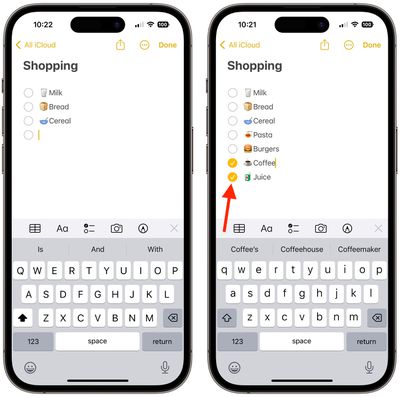 当您在 Notes 中创建清单时,每个列表项旁边都会有一个圆形项目符号,可以将其标记为已完成,这样可以方便地核对购物清单、愿望清单、待办事项清单等。