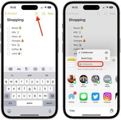 - 转到带有列表的注释,然后点击分享按钮(带有向外箭头的方块)位于屏幕右上角。