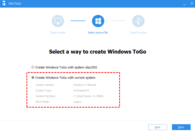 步骤 3.选择 ”使用当前系统创建 Windows To Go”。可以看到当前操作系统的详细信息,点击“下一个”。