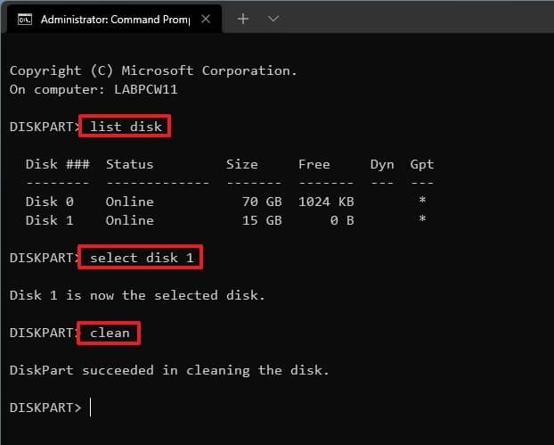 • 选择磁盘1(请将“1”替换为您自己的USB编号)