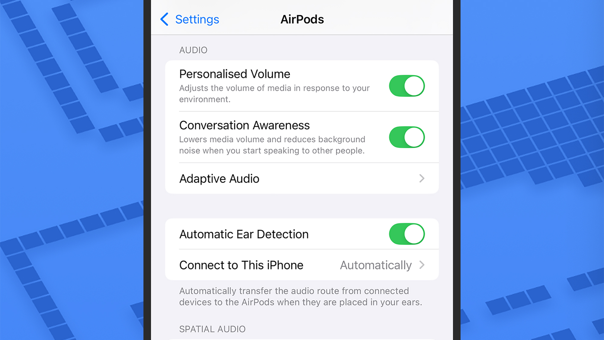 您会注意到,您可以在iOS,iPados和MacOS上的AirPods设置屏幕上调整其他各种选项。有一个自动耳朵检测例如,切换开关,例如:如果您不希望在将AirPod从耳朵中取出时自动暂停,请禁用此功能。