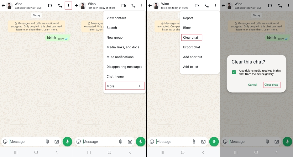 如果您不愿意一一选择删除 WhatsApp 消息,您可以选择清除单个 WhatsApp 个人或群组聊天或一次性清除所有 WhatsApp 聊天。清除聊天可以清除所有消息,但会将聊天线程保留在列表中。