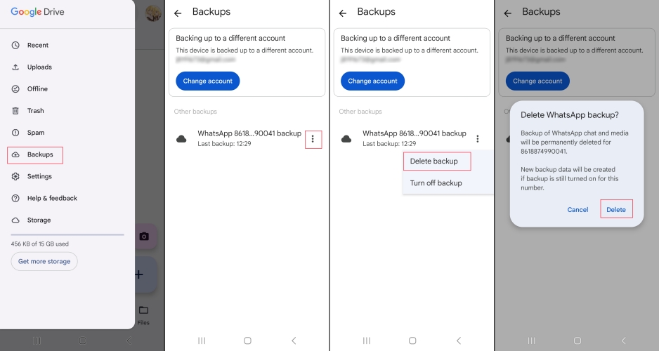 步骤 4。轻敲删除从 Google 云端硬盘删除 WhatsApp 备份。