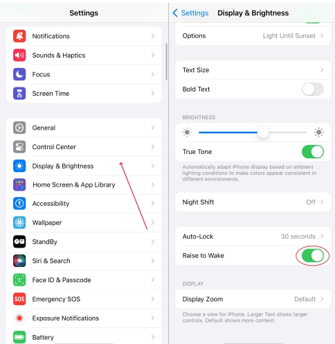 步骤 2. 转到“显示和亮度”并切换“醒来”在。