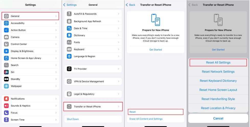 步骤 2. 点击一般的, 然后转移或重置 iPhone。