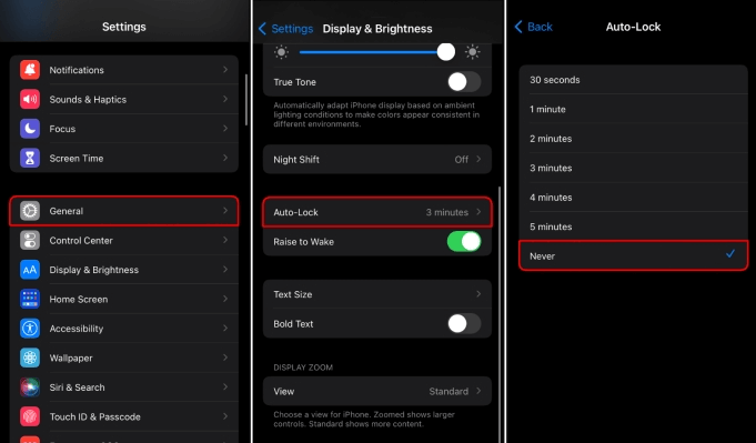 如果您运行的是 iOS 7 或更高版本,您可以通过几个步骤直接禁用 iPhone 上的自动锁定。只需通过以下步骤即可完成此操作。