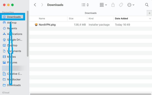 - 导航至下载文件夹在您的 Mac 设备上并找到该文件NordVPN.pkg。单击它。