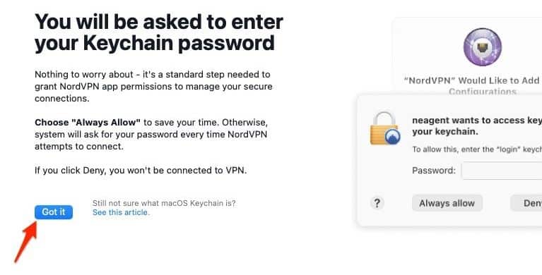 - 将弹出一个提示,请求安装权限“帮手”。该工具用于创建安全 VPN 隧道。输入您设备的密码并点击好的在相关 Mac 型号上确认/或使用您的指纹。