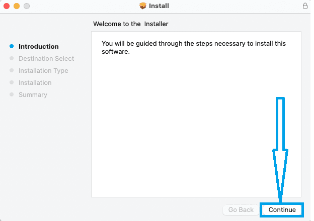 - 将弹出一个新窗口,指导您完成安装过程。点击 ”继续”。