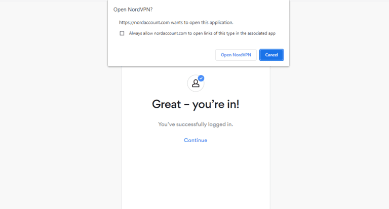 - 在弹出的窗口中,点击“打开 NordVPN 应用程序”并选中该框“始终允许 Nordaccount.com 打开此类链接……”