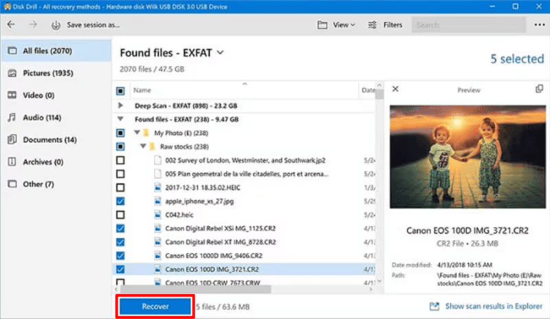 本质上,扫描后,Disk Drill 将可恢复内容分组,以便您可以轻松地按类型查找文件。 Disk Drill 的算法适用于手机内部存储器和外部 SD 卡。其界面还允许您暂停扫描并设置过滤器来优化搜索,从而轻松准确地找到您需要的内容。