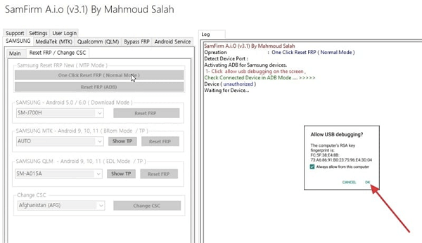 - 第6步:如果您收到允许 USB 调试的提示,请单击好的。 FRP 旁路将会启动,但需要一段时间,因为您已在手机上激活了 USB 调试。完成后,您的三星手机将自动重新启动。