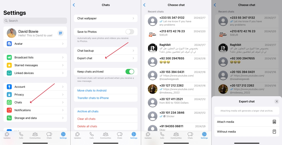 保存 WhatsApp 消息的另一种快速方法是导出 WhatsApp 聊天记录。通过这种方法,您可以有效地将聊天中的所有WhatsApp语音消息导出并下载到您的手机上。但是,如果您的目标语音消息分散在不同的聊天中,则可能会有点棘手。