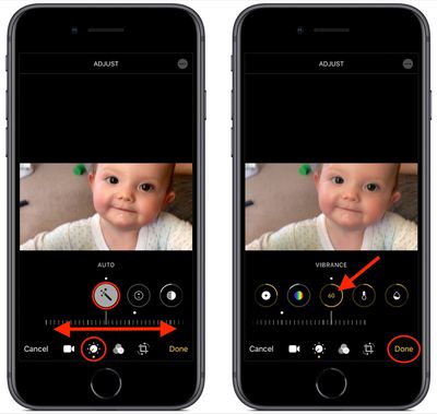 水平条中可用的其他调整工具包括接触,亮点,阴影,对比,亮度,黑点,饱和,活力,温暖,着色,清晰度,定义,降噪, 和小插图。只需轻按完毕当您乐意应用并保存您的调整时。