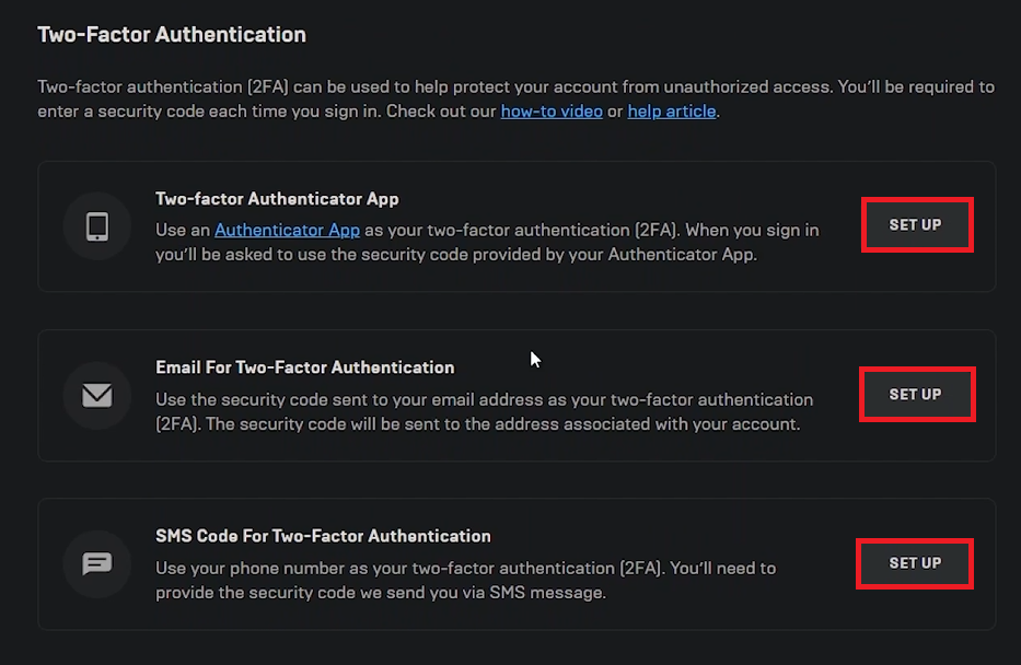 要激活 2FA,请打开 Epic Games Launcher,转至“帐户”设置,选择“密码和安全性”,然后从三种 2FA 方法中进行选择:身份验证器应用程序、电子邮件或短信。