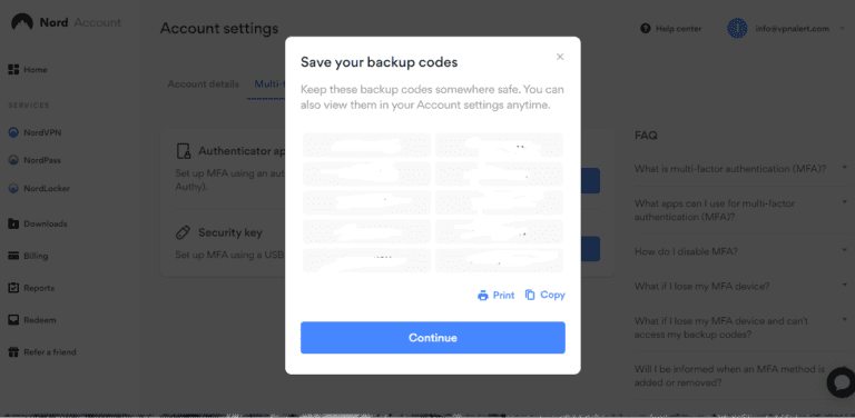 您可以使用预先保存的备份代码之一登录您的 NordVPN 帐户并禁用多重身份验证。您还可以联系 NordVPN 客户服务以获得更多指导。