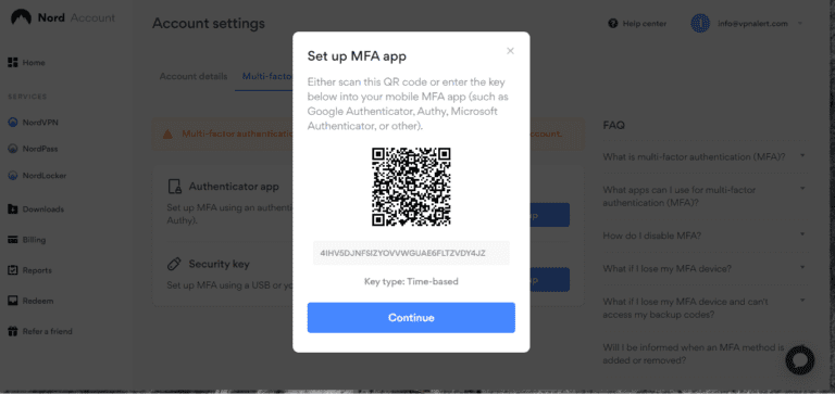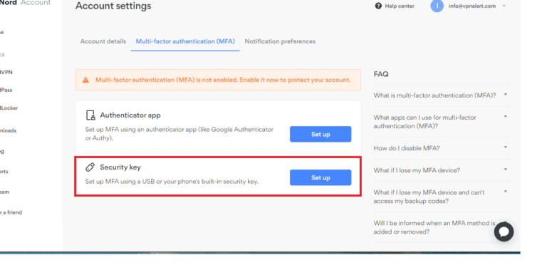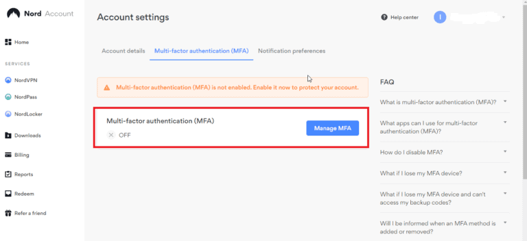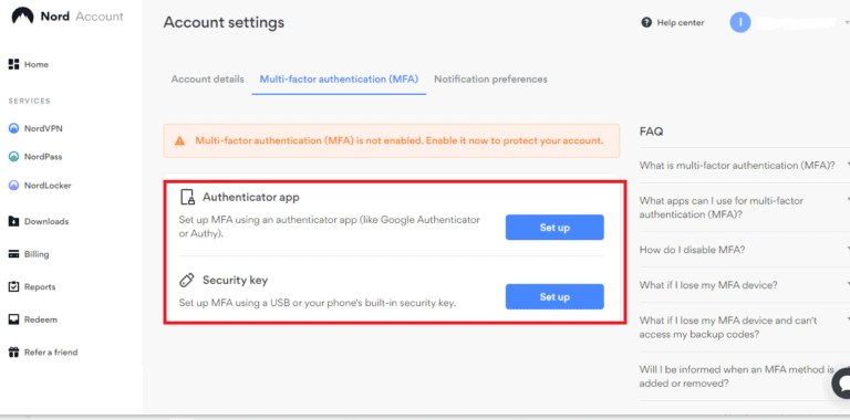 是的,您可以从帐户设置中关闭 NordVPN 的 MFA,但不建议这样做。相反,您可以减少已启用的 MFA 选项或切换到提供商提供的其他选项。