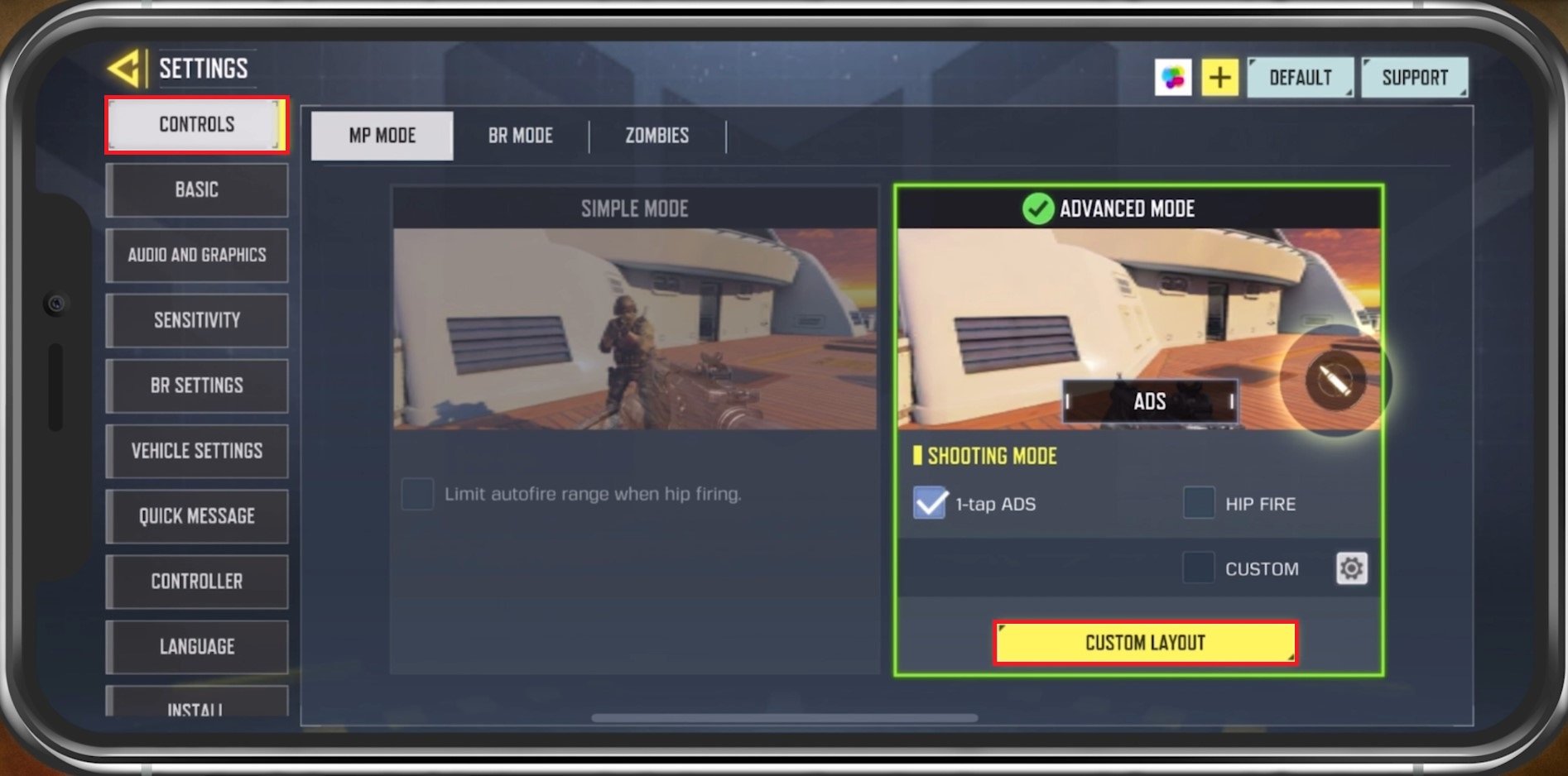 在基本的选项卡,下多人模式,您可以禁用隐藏俯卧按钮选项。这将允许您在玩 CoD Mobile 时使用单独的按钮进行俯卧。您可以禁用相同的选项大逃杀和僵尸游戏模式。