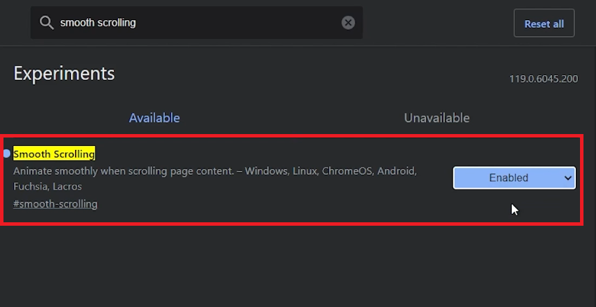 找到平滑滚动:使用标志页面顶部的搜索栏搜索“平滑滚动”。按 Enter 键过滤掉此特定功能。