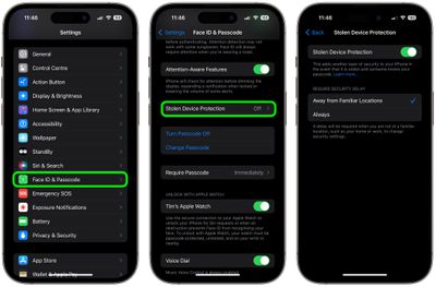 请注意,如果您的 iPhone 运行的是 iOS 17.4 或更高版本,则此屏幕上的附加选项可让您选择在设备运行时需要安全延迟。远离熟悉的地点, 或者总是。否则,这就是全部了。您可以通过切换来轻松关闭该功能被盗设备保护切换,但您需要进行身份验证才能执行此操作。