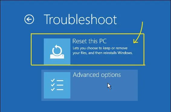 - 因此,从“恢复”菜单中转到“疑难解答”,然后单击“高级选项”。