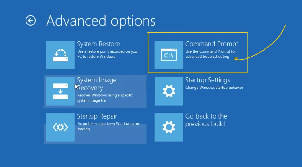- 单击“高级选项”,然后转到“疑难解答”,然后单击“高级选项”,最后单击“命令提示符”。