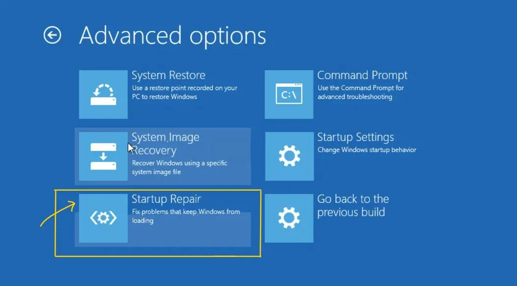 - 在恢复模式下单击“疑难解答”,然后转到“高级选项”并选择“启动修复”。