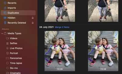 在“重复项”相册中,所有重复项均按时间顺序列出,并带有合并每组旁边的选项。您可以单击此按钮将重复的照片集合并到单张照片中。即使您将两张非常相似的照片放在一起,Apple 的合并功能也会智能地保留最高的细节和最多的元数据,从而创建最佳的图像。