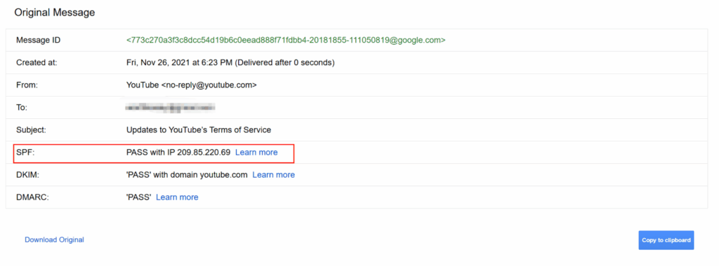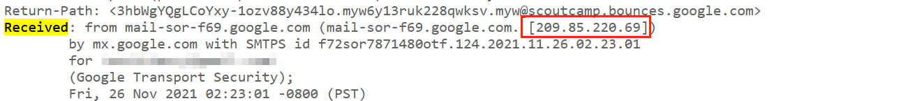 查找以“SPF”或“spf=pass”开头的行。这些行确认发件人域使用的 IP 地址,可能如下所示: