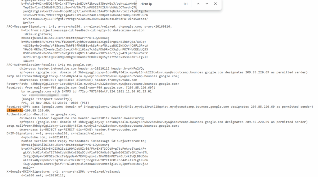 如果您使用的是 Gmail,请使用 Ctrl + F (Windows) 或 Cmd + F (Mac) 搜索“client-ip”。您可能会看到类似这样的行: