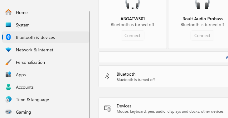 步骤 2:单击左侧窗格中的蓝牙和设备选项卡以及框右侧部分的设备选项。