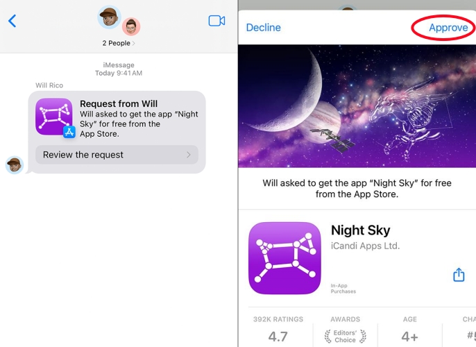 当您的孩子从 App Store 或 iTunes 进行购买时,您将自动在您的设备上收到。您可以在 iPhone 上的“信息”中找到该请求。此外,您还可以在 iPhone、iPad、Apple Watch 或 Mac 上的通知中心找到该请求。