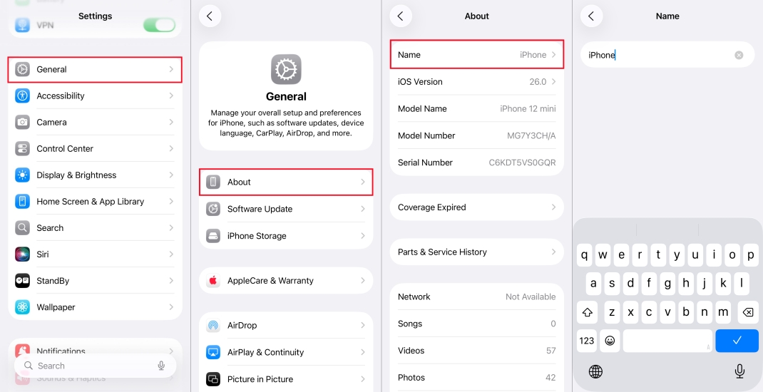 步骤2。轻敲关于 > 姓名并输入不同的名称。
