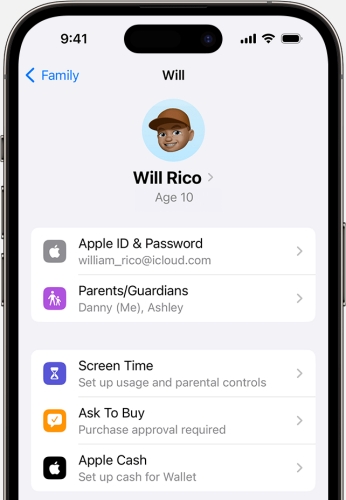 请务必在孩子的设备上填写联系卡,包括他们的全名和 Apple ID 电子邮件地址或电话号码。然后,可以将询问购买通知发送到家长的设备。这意味着家长的设备可以接收这些通知。