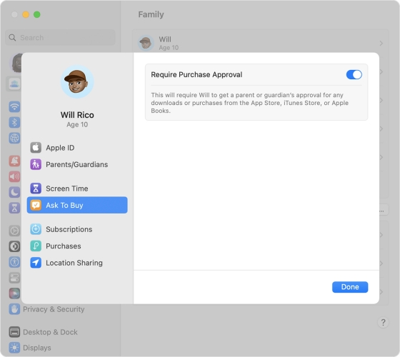步骤2。单击您孩子的姓名并选择询问购买在侧边栏中。